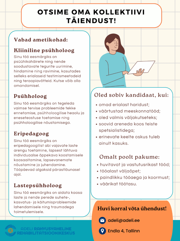 Tule meile! 🤸🏼♀️Meie vahva ja laienev meeskond ootab meiega liituma laste psühholoogi.📞Huvi korral võtta meiega ühendust. Või kui tead sõpra, kellele antud amet sobiks, jaga kuulutust temaga! Uuendatud 25.09.2025